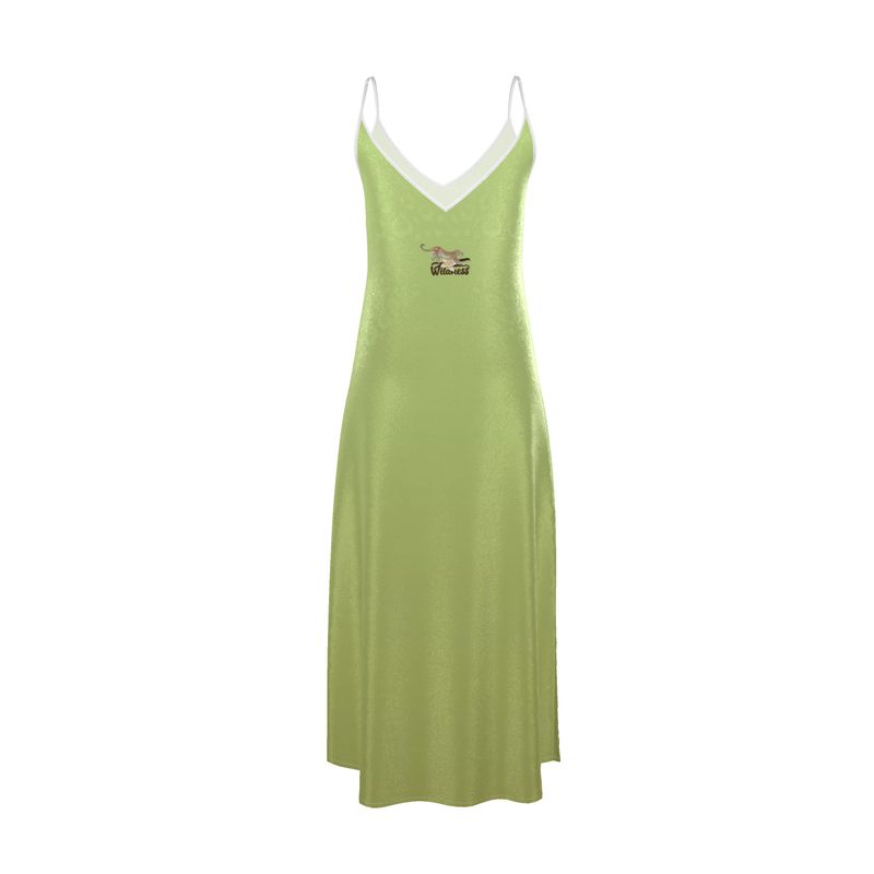This piece flows like a second skin, a timeless classic Maxi slip dress in 100% pure silk. Its soft pistachio green tone shimmers with a subtle tonal leopard texture, while the back reveals a graceful leopard illustration and the word “wildness” — a gentle whisper of your untamed spirit.