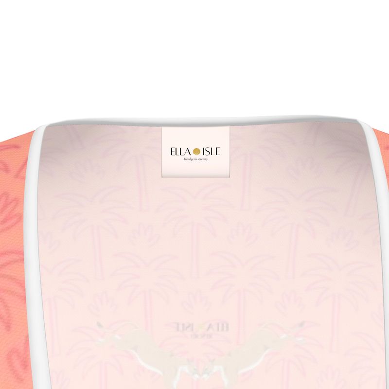 Let your vacation begin the moment you slip into this dress.Crafted from pure satin silk that glides against your skin like a warm breeze, this peach wrap dress brings soft sunsets and swaying palms to life. Its delicate white edging, feminine ruffle hem, and subtle palm motif echo the elegance of barefoot walks and golden-hour rituals.A pair of graceful lionesses rests quietly on the back — a quiet symbol of freedom, elegance, and soulful connection.